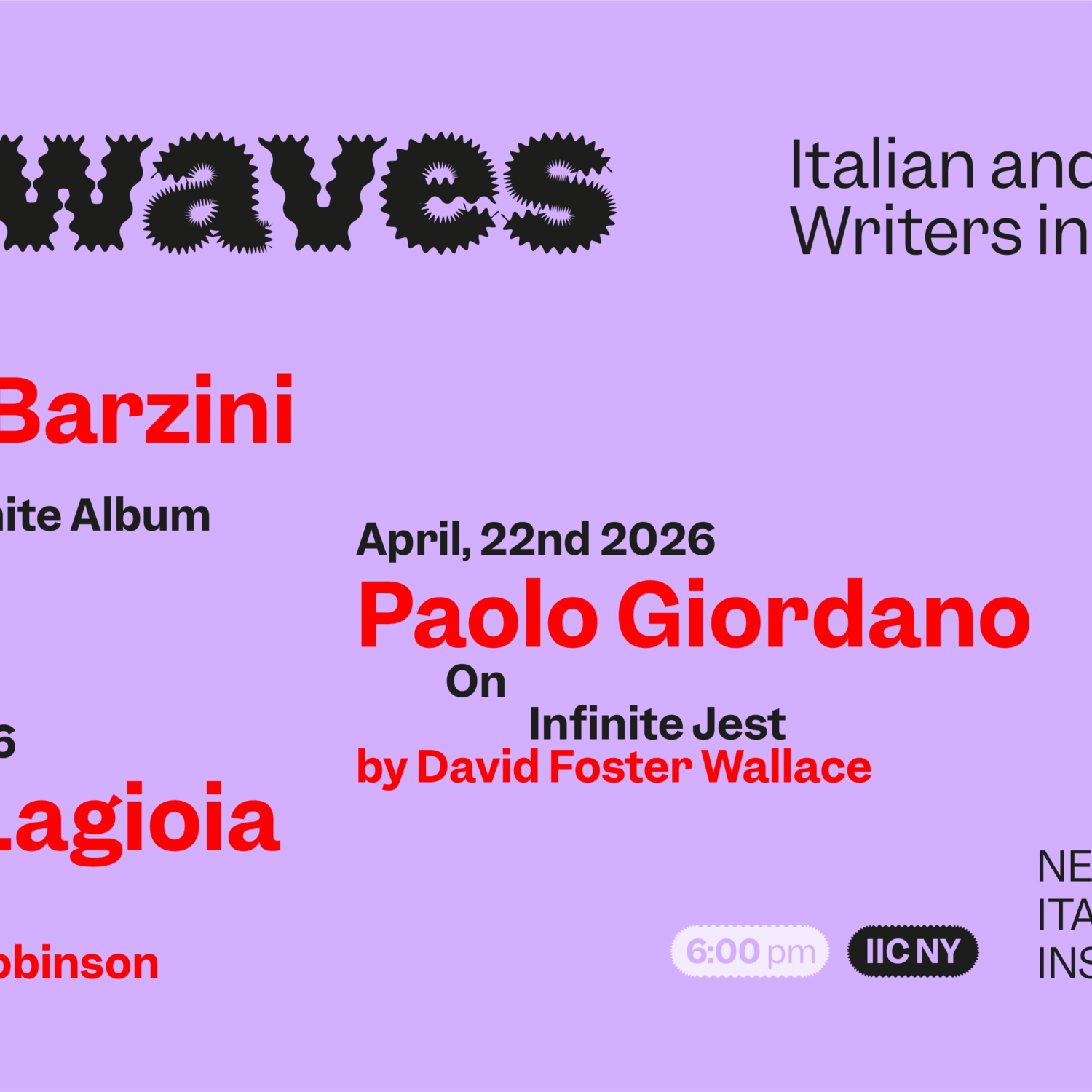 Inkwaves è infatti un ciclo di incontri all’interno del quale si chiederà a scrittori italiani contemporanei di raccontare un libro, scritto in inglese o in italiano, che ha inciso in modo rilevante sulla loro formazione. Una conversazione critica e personale, insomma, incentrata sulla lettura come esperienza fondativa. Il progetto è organizzato dall’Istituto Italiano di Cultura di New York insieme all’agenzia letteraria Alferj e prevede la partecipazione, accanto agli autori, di accademici, traduttori ed editori statunitensi.